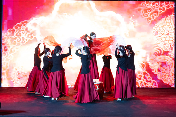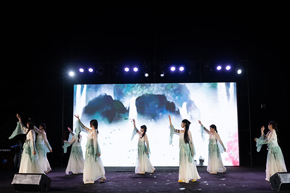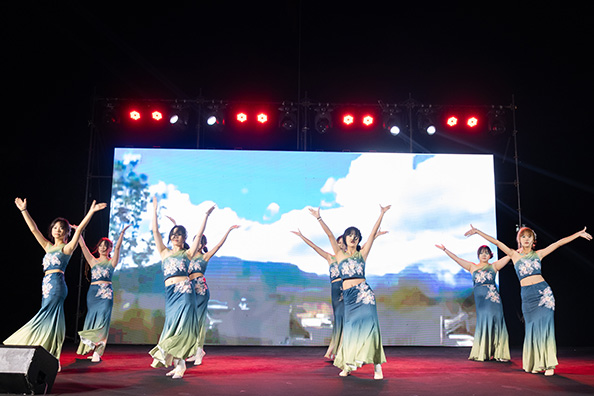 在滿滿的期待中,暖場視頻緩緩拉開帷幕——來自校企合作企業(yè)及兄弟院校的節(jié)日祝福,為晚會注入了濃濃的溫情與祝福。晚會開始,倒計時聲響徹夜空,開場舞《錦繡山河·同心賦》以磅礴氣勢點燃全場,舞者們用曼妙舞姿描繪祖國壯美山河,瞬間將觀眾帶入喜慶祥和的氛圍中。